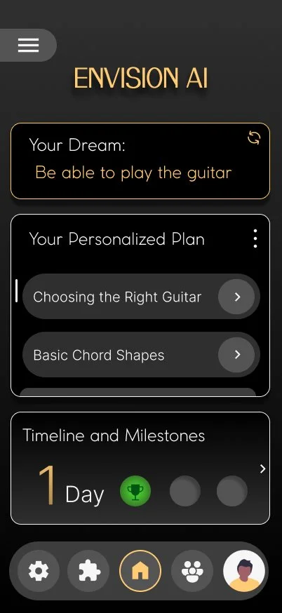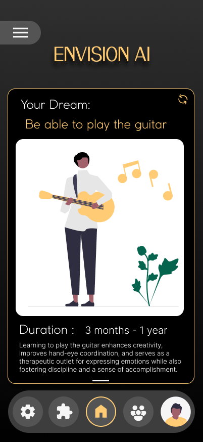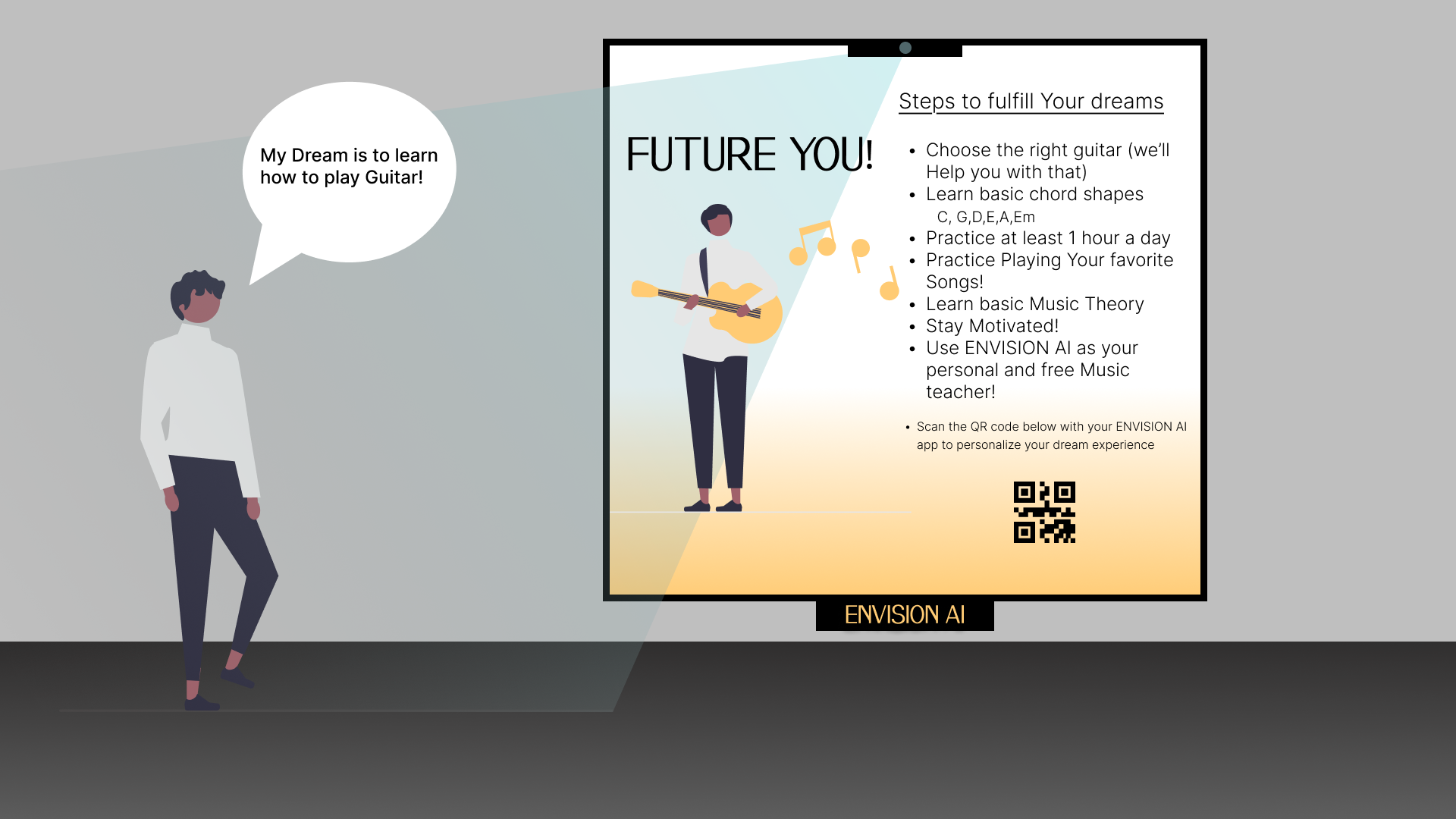 This concept isn’t just a motivational app; it’s an immersive art installation. Participants enter a space with five large screens and lines leading to each station. When at the front of the line, users are prompted to share their goal—like “learning to play the guitar.” Envision AI then scans them and generates a personalized image or video of themselves confidently playing the guitar. This visual serves as inspiration, especially for the 65% of people who are visual learners. The screen would then showcase the user journey map on how to achieve this goal. After the user sees themselves living their dreams and the steps to achieve this dream, the user receives a QR code linking them to the EnvisionAI app, transforming the installation experience into a personal, interactive tool for daily use. Once the app is opened, the user is presented with the journey map on how to make their dream come true. This Journey map would be divided into modules where each section is a different step in achieving your dream. These small divided up steps would be beneficial for the user not to get overwhelmed with learning and would have deadlines to keep the user on track. For this instance, the modules are catered toward learning the guitar. It’s divided up into separate sections like: choosing the right guitar, learning basic chord shapes and strumming, practicing, music theory, and more. After the completion of different sections of the module, users receive milestone rewards and motivational affirmations as they progress. The app adapts to their lifestyle—accounting for work schedules, financial limitations, physical abilities, location, and social dynamics—to ensure the plan is realistic and achievable. Envision AI blends cutting-edge technology with the emotional resonance of art. It doesn’t just visualize dreams; it empowers users to achieve them, leaving a lifelong impression. By integrating AI into the realm of art, Envision AI creates a transformative experience, proving that art, at its best, not only inspires but also changes lives.