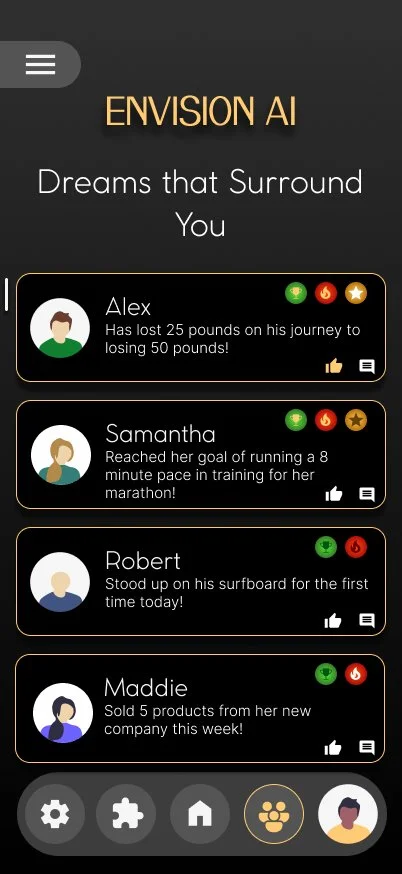 Many people grow up with dreams and set goals for themselves, but every-day distractions and outside responsibilities can get in the way. Envision AI is an interactive project where the audience inputs a dream or a goal that they have always wanted - like losing 50 pounds, running a marathon, starting a company, winning a competition, being an actor, or any sort of attainable goal within this lifetime. Envision AI then scans the user and uses image generating software like DALL-E 3 or Midjourney to create a personalized visualization of what the user would look like at their end goal. In addition to this, EnvisionAI would give the user a personalized journey map on how to achieve their goal, and would break the journey into smaller, measurable steps with deadlines. The main goal of this project is to change peoples lives for the better. An app like EnvisionAI could help people live the lives that they truly want. Successful art leaves a prominent impression on the audience, Envision AI would leave a positive life long impression for its users.