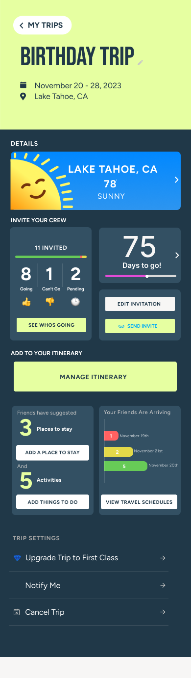 Users were frequently overlooking important features like the invite and itinerary buttons, which were either poorly labeled or inconsistently placed. My goal was to improve the visual hierarchy and discoverability of core actions, making the Trip Hub more intuitive and user-friendly. Through iterative design and feedback from the team, I introduced a tile-based layout that better organized content and streamlined the planning experience for users.